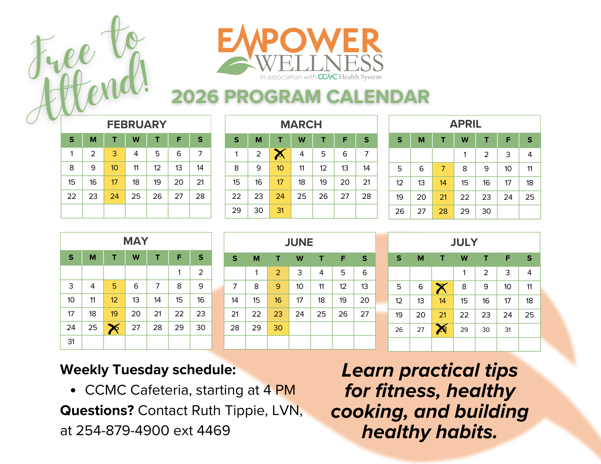 Classes are FREE to attend, held in the CCMC Cafeteria on Tuesdays at 4 PM (unless otherwise noted on the calendar).